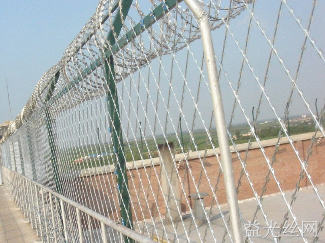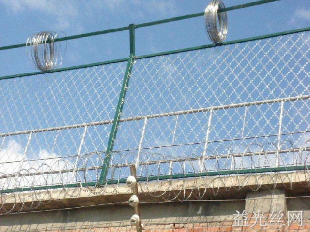 產(chǎn)品特點(diǎn):監(jiān)獄防護(hù)網(wǎng)具有防腐、防老化、抗曬、耐候等特點(diǎn)。螺旋型交叉刀片刺網(wǎng)是在兩條刀片刺網(wǎng)之間以不銹鋼片和鍍鋅鋼片強(qiáng)力夾扣,展開后即呈交叉狀,美觀又實(shí)用。
